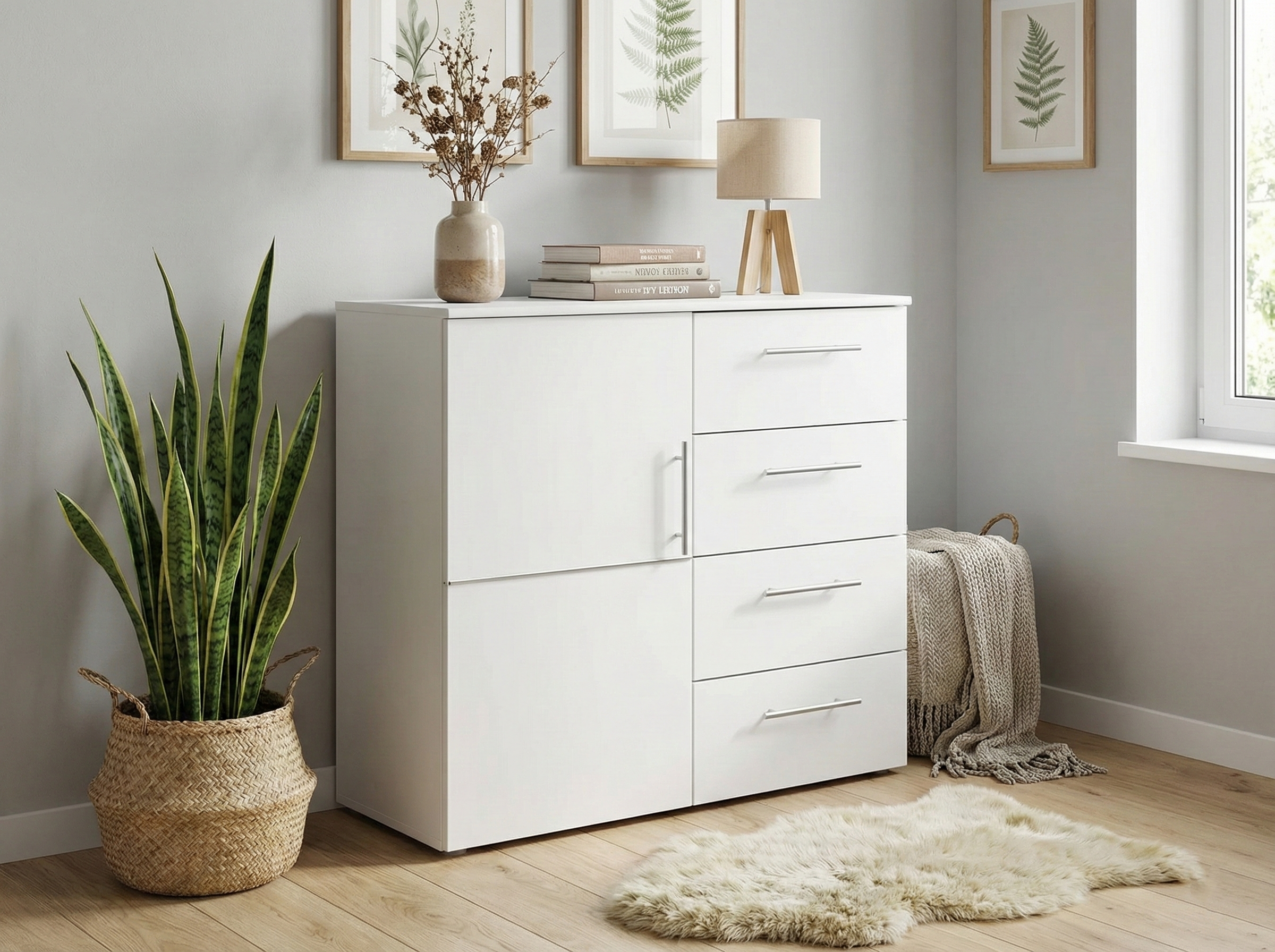 The white Punto dresser is a practical storage solution for any room of your home. Its neat dimensions of 880 mm wide, 910 mm high and 380 mm deep offer a surprisingly roomy interior, ideal for organizing clothes, documents, decorations and other essential items. The carefully designed layout of lockable cabinets and drawers helps keep things organized and easily accessible.