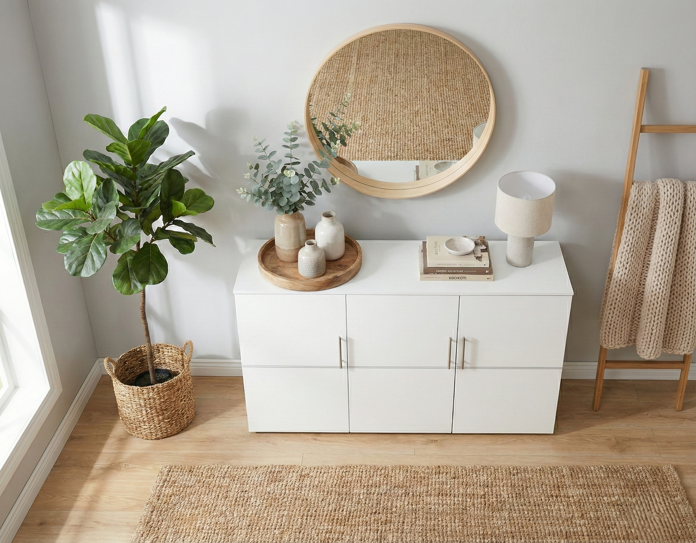 Komoda biała z czterema szufladami i drzwiami do kuchni, salonu, pokoju