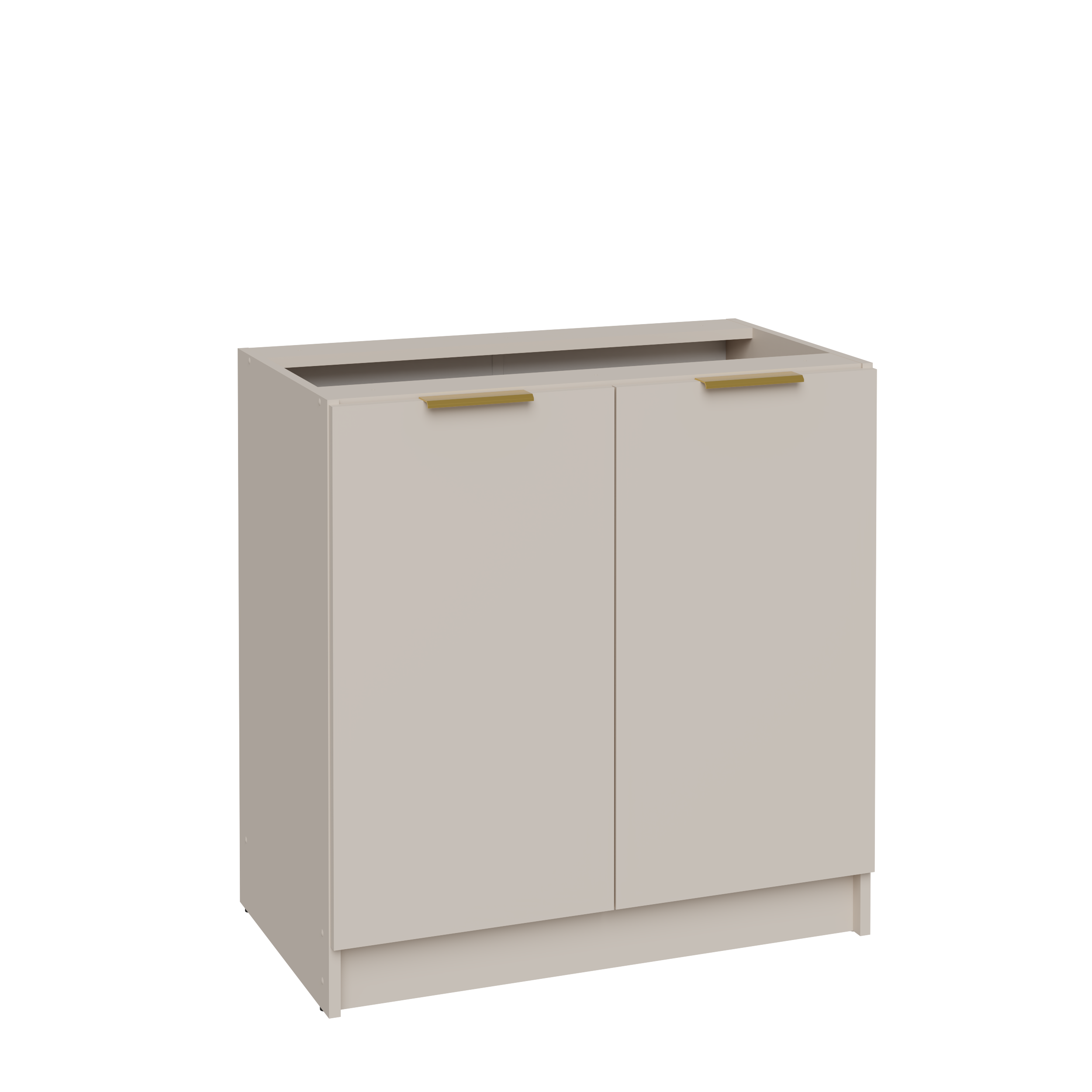 Eleganckie kaszmirowe fronty zestawione z dekorem dębu linea tworzą spójną i stylową całość. Dwa szerokie fronty drzwiowe z subtelnymi złotymi uchwytami podkreślają nowoczesny charakter mebla.