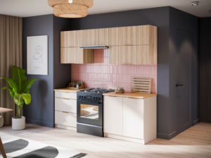 Połączenie kaszmirowych frontów z dekorem dębu linea tworzy nowoczesny i ponadczasowy wygląd. Górne szafki wyróżniają się dekoracyjną, ryflowaną strukturą powierzchni, która nadaje meblom głębi i subtelnej trójwymiarowości.