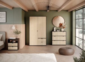 Czarny korpus stanowi wyraźny kontrast dla jasnych frontów, podkreślając loftowy styl szafki i nadając jej wyrazistości. Takie zestawienie kolorystyczne sprawia, że mebel doskonale komponuje się zarówno z nowoczesnymi, jak i bardziej klasycznymi aranżacjami sypialni.
