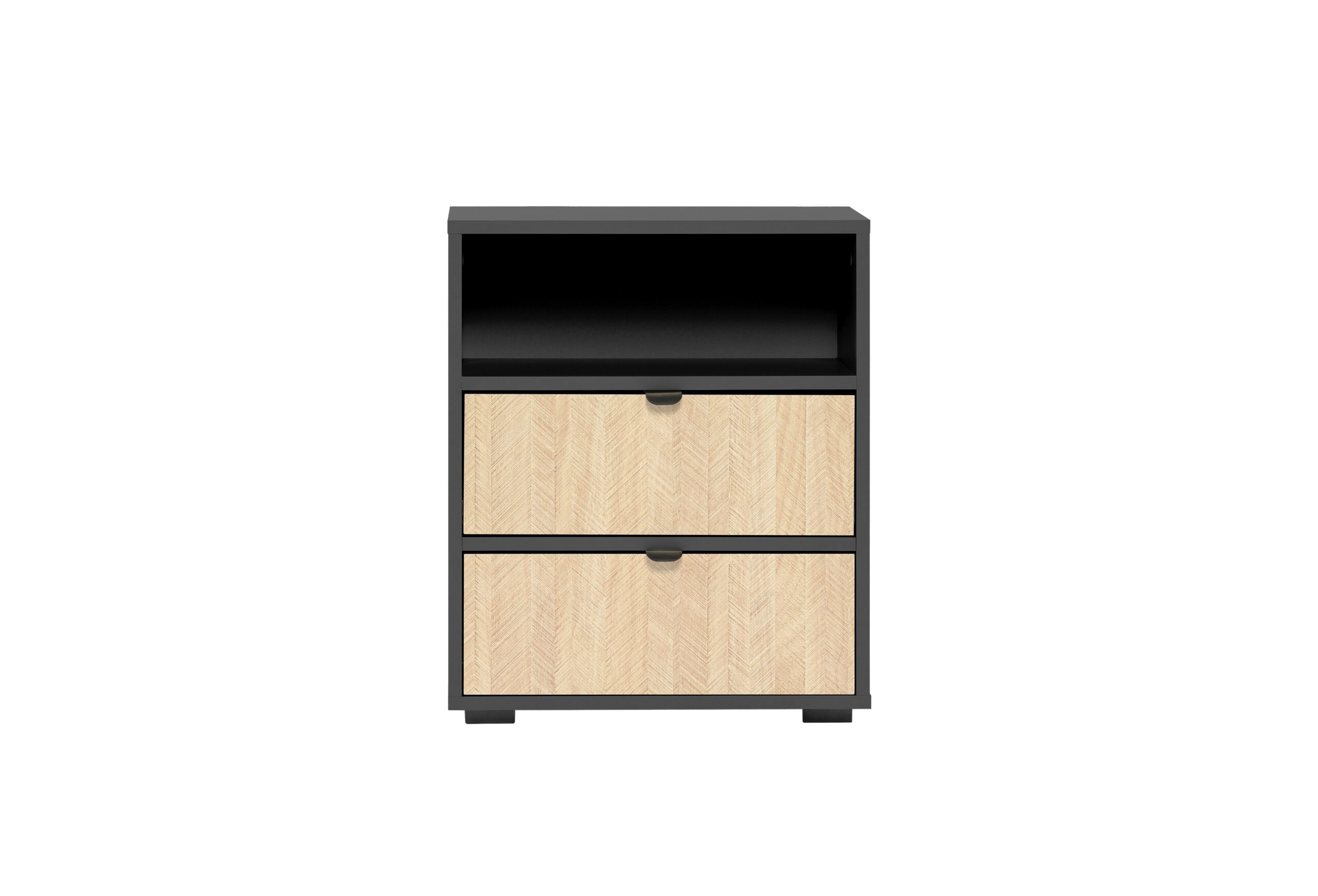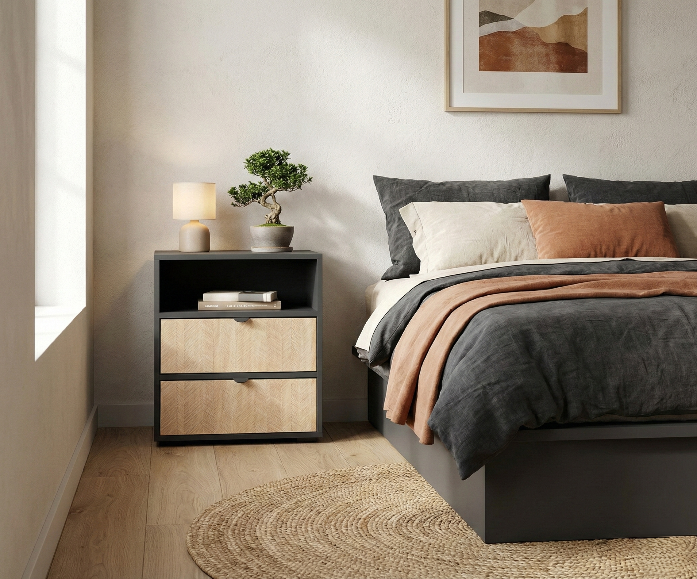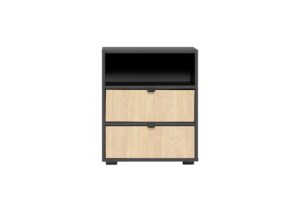 Została zaprojektowana z myślą o wygodnym użytkowaniu przy łóżku oraz estetycznym uzupełnieniu przestrzeni w sypialni. Praktyczny układ z dwiema szufladami pozwala na przechowywanie najpotrzebniejszych przedmiotów, takich jak książki, akcesoria czy drobiazgi, pomagając utrzymać porządek i organizację.