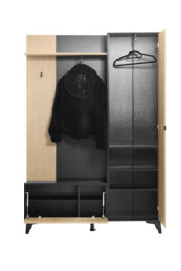 Zestaw zawiera pojemną szafę z drzwiami skrzydłowymi, która kryje w swoim wnętrzu funkcjonalny układ półek oraz drążek na ubrania, pozwalając na wygodne przechowywanie płaszczy, kurtek czy sezonowej garderoby. Obok niej znajduje się panel z czarnymi, metalowymi wieszakami, idealnymi na odzież wierzchnią, torby czy plecaki. Nad nimi zaprojektowano otwartą półkę na czapki, szaliki lub dekoracyjne elementy. Praktycznym uzupełnieniem całej kompozycji jest niska szafka z szerokim siedziskiem – doskonała do przechowywania obuwia oraz jako miejsce do wygodnego przebierania się.