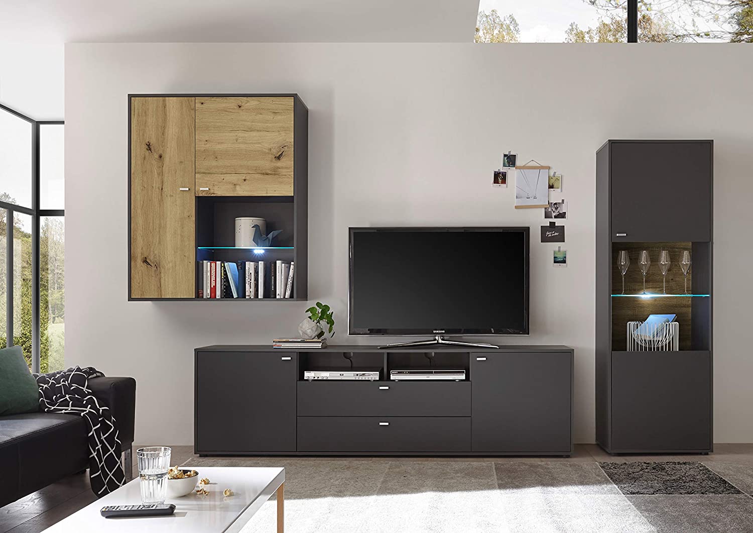 Meblościanka CLEVELAND to idealne rozwiązanie dla osób, które cenią sobie nowoczesny design połączony z funkcjonalnością. Wykonana w eleganckim połączeniu kolorów Szary Grafit i Dąb Artisan, meblościanka doskonale wpasuje się zarówno w nowoczesne, jak i klasyczne wnętrza. To propozycja, która przyciąga wzrok naturalnym wykończeniem i kontrastowym zestawieniem kolorystycznym, podkreślającym charakter mebli.