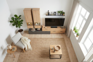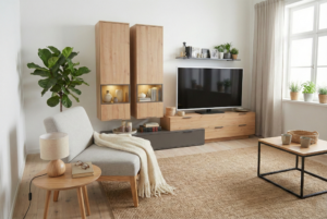 Segment pokojowy Lotus to połączenie nowoczesnego wzornictwa z ciepłem naturalnego drewna, które doskonale wpisuje się w wystrój współczesnych salonów. Zestaw składa się z wiszących witryn, komody RTV oraz półki ściennej – każda z części została zaprojektowana z myślą o estetyce, ergonomii i praktycznym przechowywaniu.