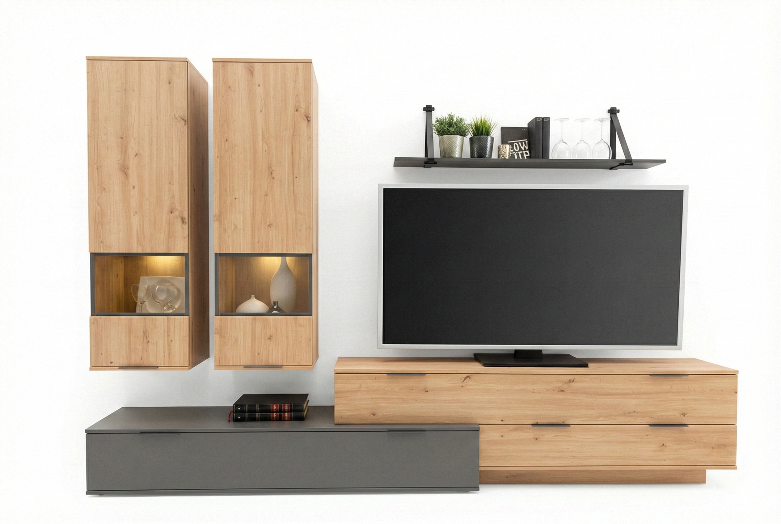 Segment pokojowy Lotus to połączenie nowoczesnego wzornictwa z ciepłem naturalnego drewna, które doskonale wpisuje się w wystrój współczesnych salonów. Zestaw składa się z wiszących witryn, komody RTV oraz półki ściennej – każda z części została zaprojektowana z myślą o estetyce, ergonomii i praktycznym przechowywaniu.